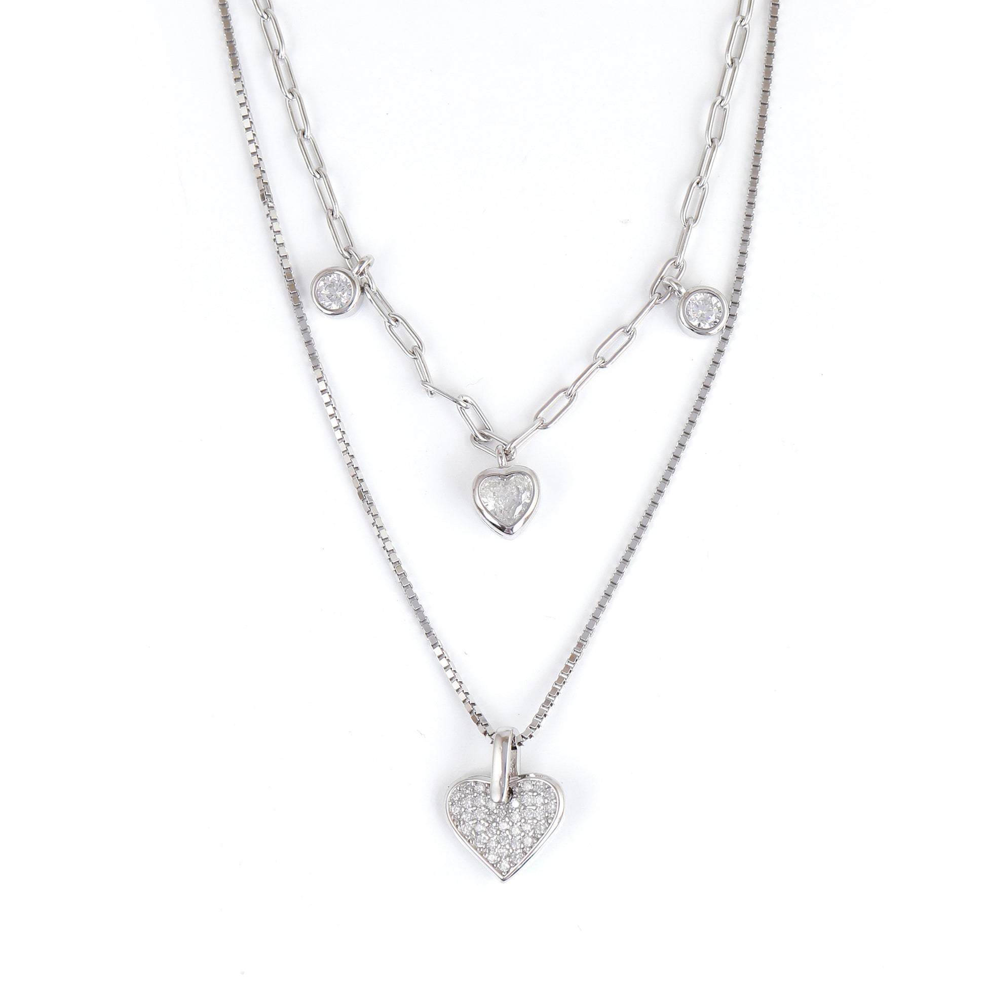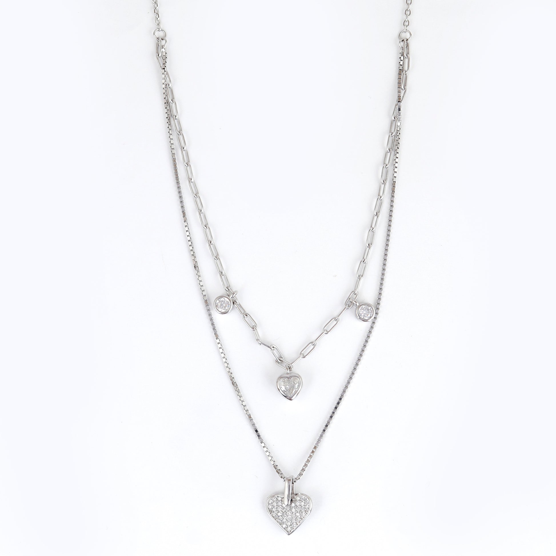 Fall in love with elegance every day with this dual-layered heart pendant necklace crafted in 925 sterling silver. The modern design features a mix of box and paperclip chains, adorned with two sparkling heart pendants and bezel-set CZ stones for a refined yet romantic finish.