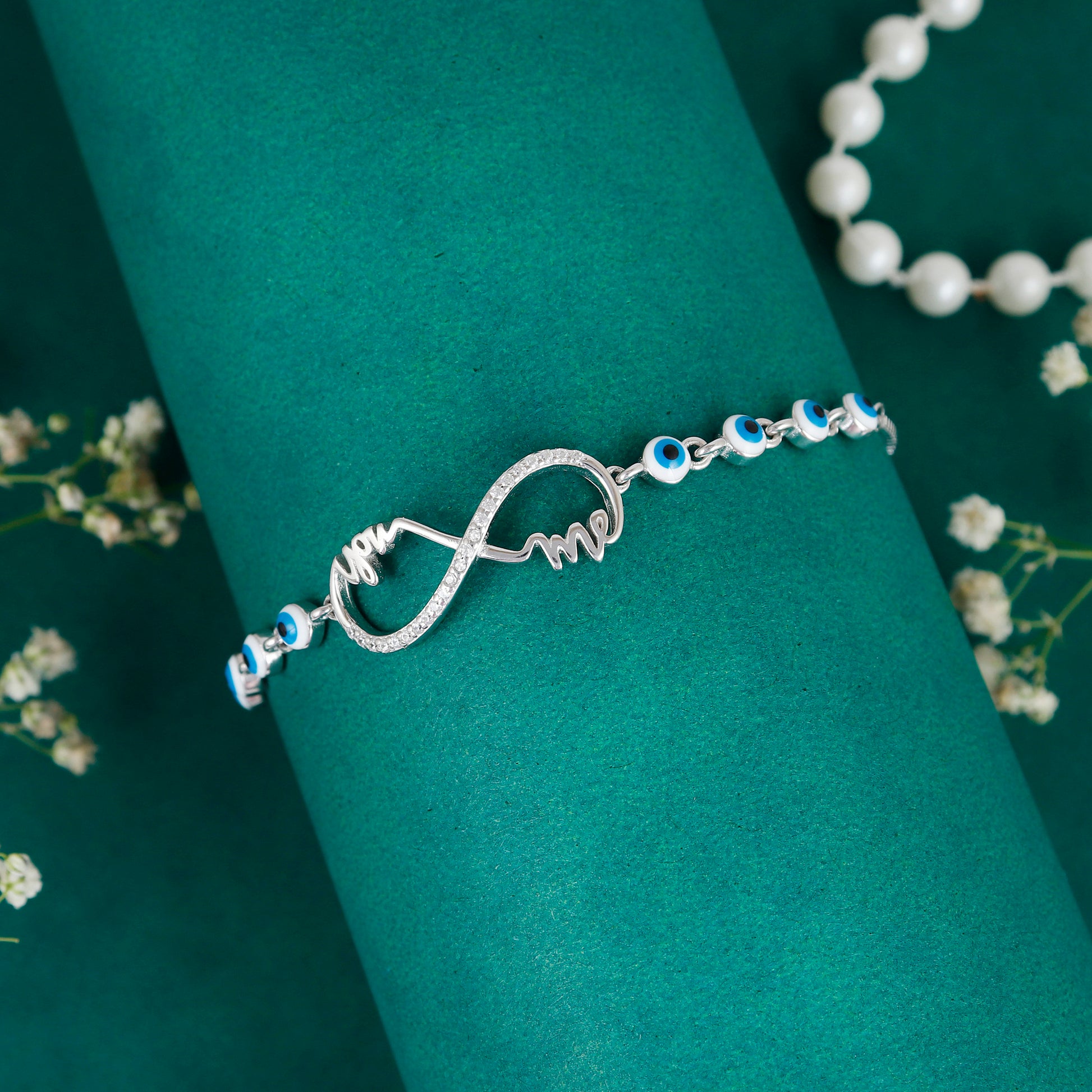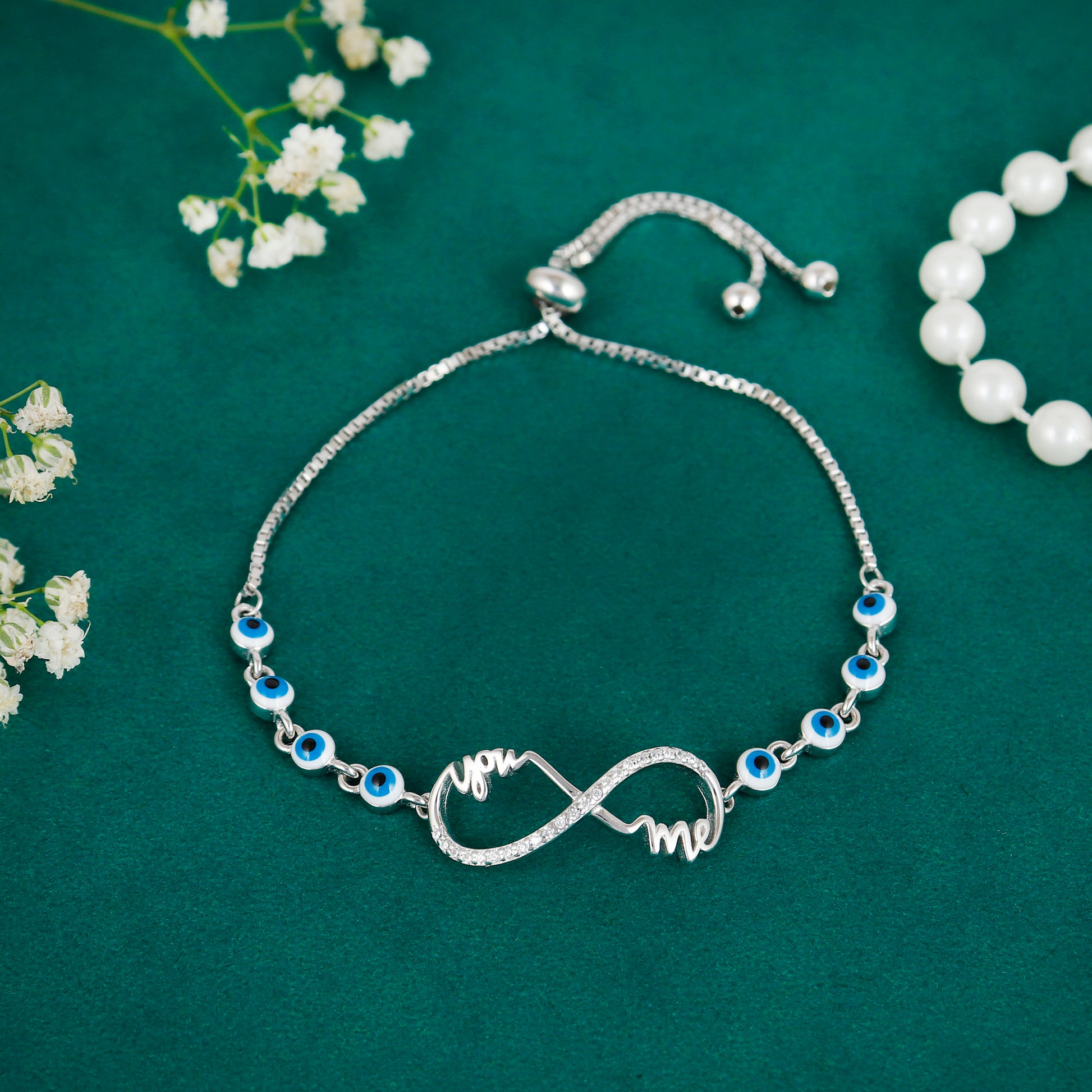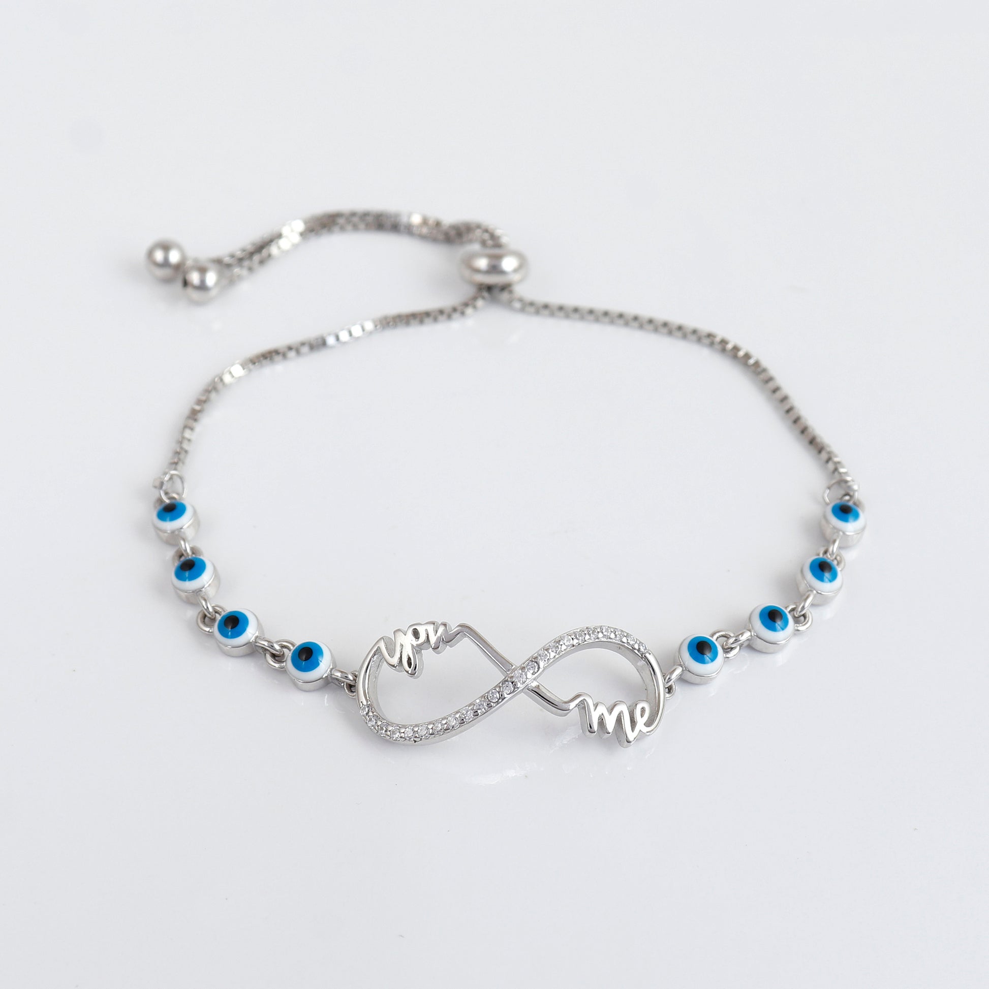Sterling silver infinity “You & Me” bracelet with evil eye charms – symbol of eternal love & protection. Perfect gift for couples & daily wear.