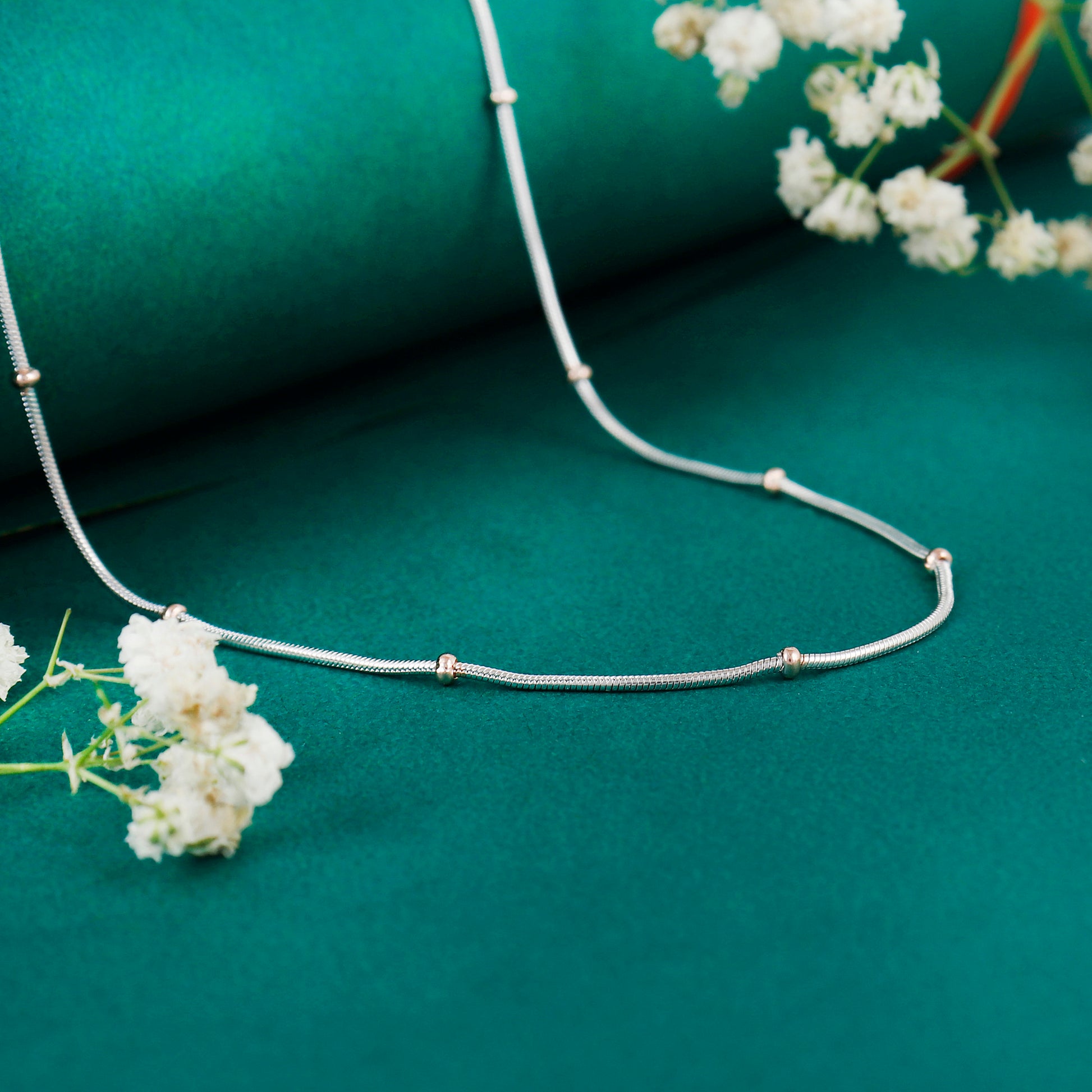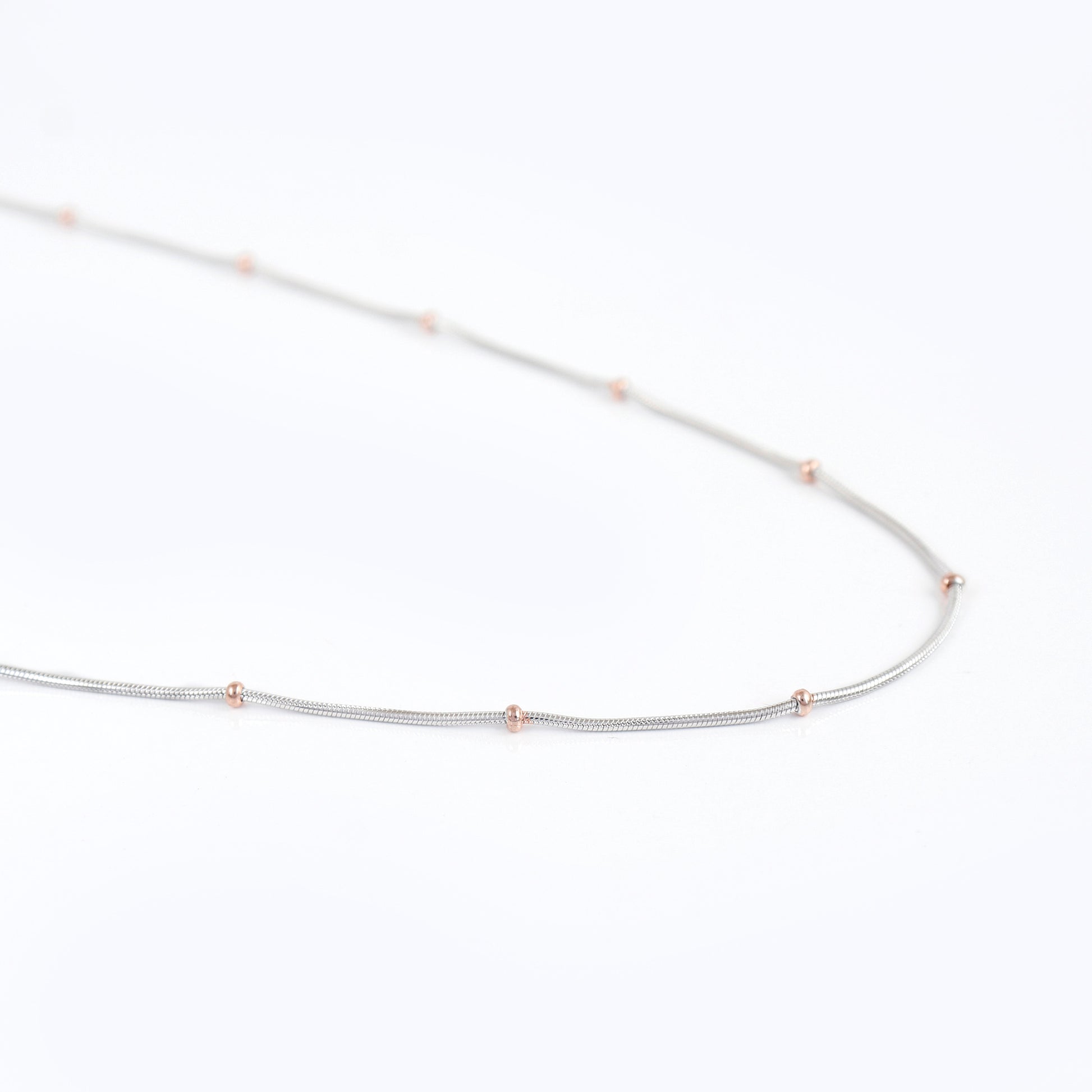 Enhance your style with this Italian Silver 925 beaded chain, designed with delicate silver links accented with rose-gold beads. A trendy and fashionable accessory, this chain is hypoallergenic, durable, and perfect for layering or wearing solo